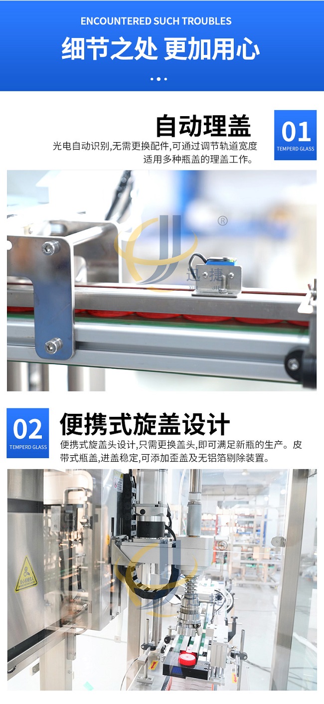 跟蹤式旋蓋機是在聯機取放旋蓋機的基礎上設計的,它解決了聯機拾放旋蓋機容量低的問題,其運動由運動控制器控制,比PLC更、更準確,封蓋時,封蓋頭隨著瓶子的移動而移動。它可以配備一個或兩個封蓋頭,容量從 40B/M 到70B/M 無需考慮瓶子和蓋子的大小(基于 100ML到5000ML瓶子)。