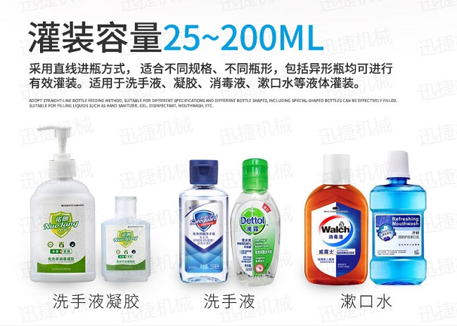 5、迅捷機械研發灌裝設備具有無瓶不灌裝、自動進瓶出瓶、自動定位灌裝、自動控制液位等功能,自動化程度高;自動化消毒液灌裝生產線灌裝嘴設計科學合理,配防滴漏裝置,灌裝不滴漏,擁有物料瓶及設備的干凈衛生。